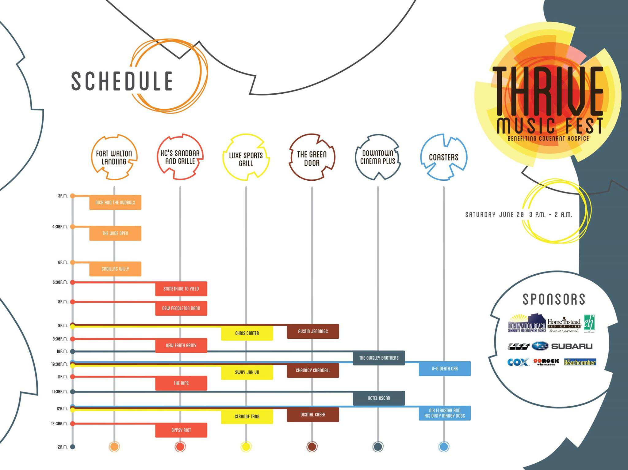 to 2 a.m. in downtown Fort Walton Beach. Advance tickets are $10 each (through June 17) and are available online at www.thrivemusicfest.org or at the Covenant Hospice branch office, 220 Eglin Parkway NE, in Fort Walton Beach.