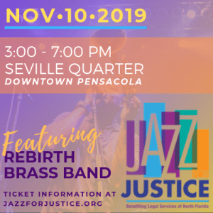 Join us at Jazz for Justice, featuring grammy award winner Rebirth Brass Band, on November 10 from 3 to 7 pm at Seville Quarter for an afternoon of rhythmic beats as part of your Foo Foo Festival experience. Entrance is free, however, guarantee your seat to watch our award-winning artists for $20 or get the VIP Experience, which includes a reserved seat, backstage access, and VIP reception, for only $50. Proceeds for Jazz for Justice help Legal Services of North Florida, a nonprofit law firm supporting those who need free legal assistance in our community.