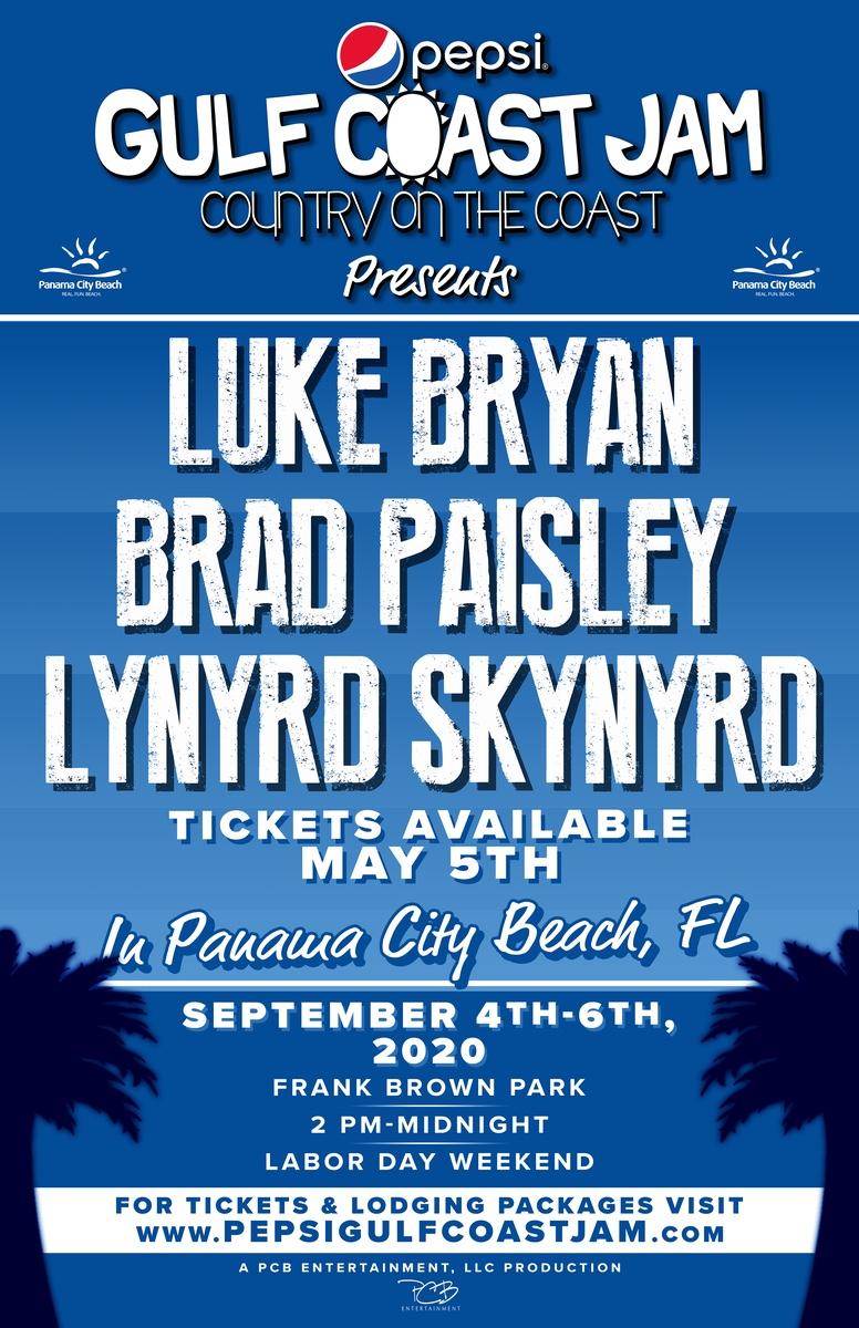 Organizers of the Pepsi Gulf Coast Jam spread some good cheer this morning, when they announced the headliners of the 8th annual Country On The Coast festival in beautiful Panama City Beach September 4-6, 2020. Executive Producer Rendy Lovelady and COO Mark Sheldon revealed headliners Luke Bryan, Brad Paisley and Lynyrd Skynyrd on the Pepsi Gulf Coast Jam Facebook page. Tickets for the three-day event will be available at www.GulfCoastJam.com beginning today, May 5, 2020.