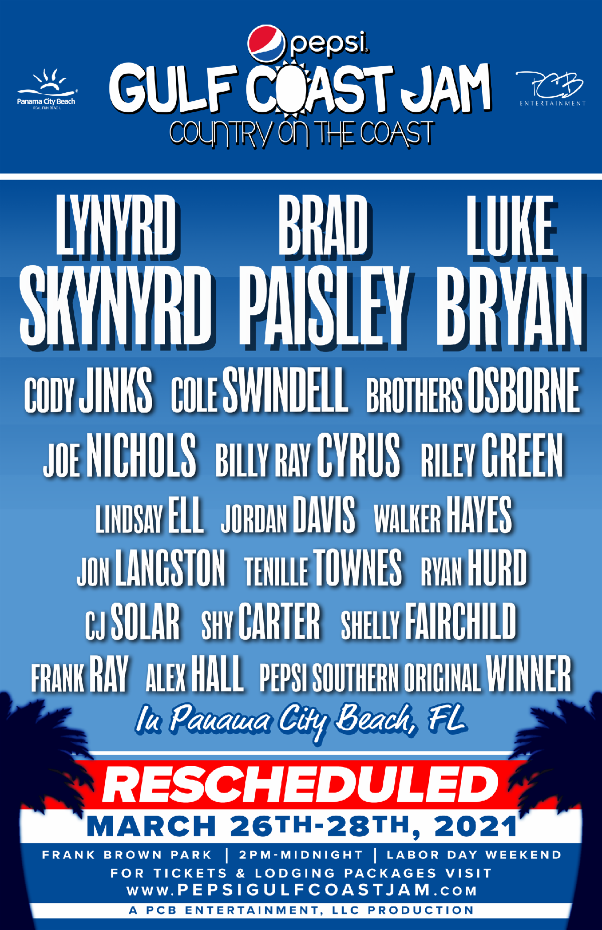 The 8th Annual Pepsi Gulf Coast Jam was set for September 4-6, 2020 at Frank Brown Park in beautiful Panama City Beach, Florida, but increasing Coronavirus numbers nationwide have forced organizers to move this year’s event to March 26-28, 2021. Luke Bryan, Brad Paisley and Lynyrd Skynyrd are still set to headline, and the rest of the previously announced lineup is still intact.