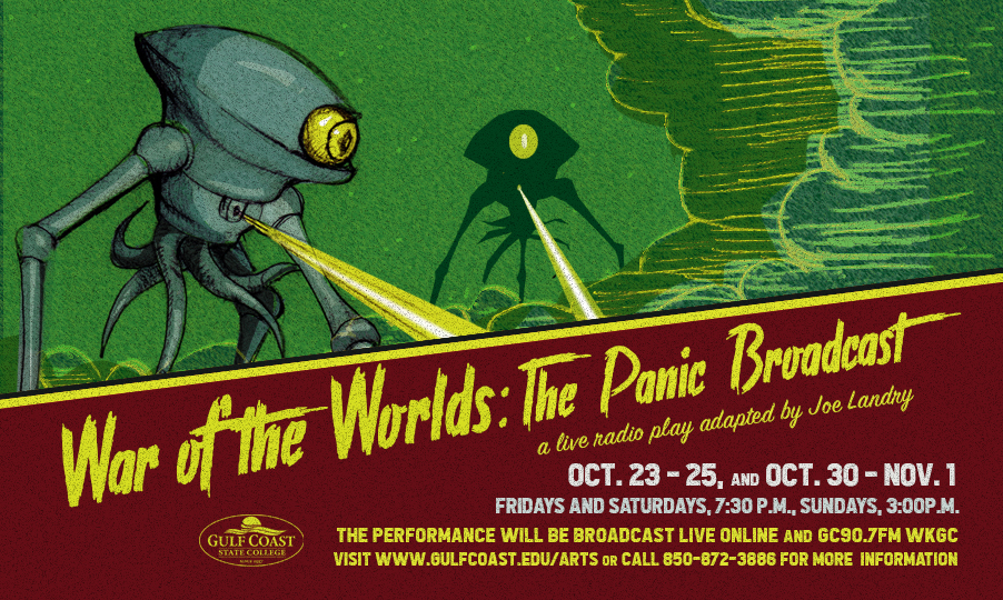 The Visual and Performing Arts Division, in partnership with Commodore Productions and WKGC FM at Gulf Coast State College, is proud to present “War of the Worlds: The Panic Broadcast” based on the classic Orson Welles radio broadcast from 1938. This production was adapted for the stage by Tom Landry. “An alien invasion throws humanity into chaos in the classic sci-fi novel The War of the Worlds, but all it took to cause real-life panic in the streets was Orson Welles’ 1938 radio adaptation, which listeners mistook for news. Now, ten years later, the WBFR radio ensemble recreates the colorful events surrounding the infamous evening, including the full original broadcast. Complete with vintage commercials and live sound effects, this radio-play-within-a-radio-play is a thrilling homage to the form’s golden age and timely reminder of what fear can do to a society.”