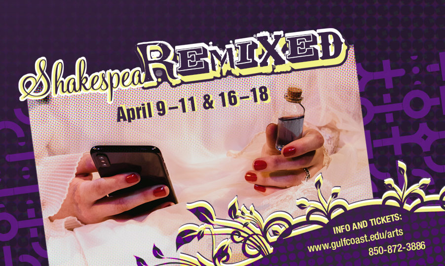 The Visual and Performing Arts Division at Gulf Coast State College presents ShakespeaREMIXED, a collection of scenes and monologues from Shakespeare’s most loved plays. Shakespeare’s original text will be used with contemporary visuals. The cast includes current GCSC students, alumni and community actors.