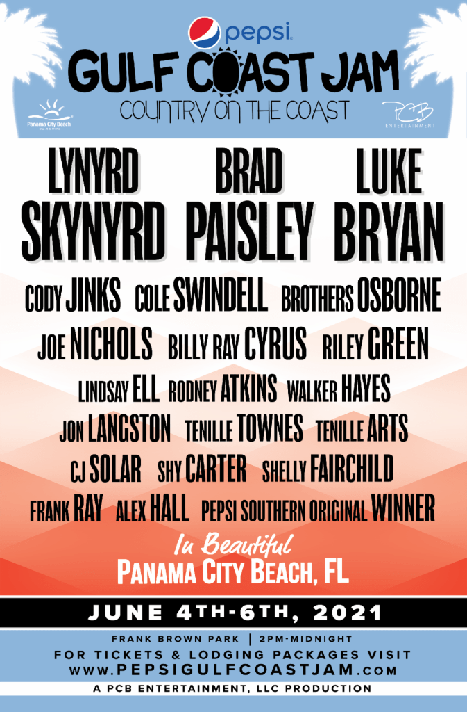 Jammers are encouraged to follow Pepsi Gulf Coast Jam at www.GulfCoastJam.com and on Facebook, Twitter and Instagram for special announcements about the Pepsi Gulf Coast Jam.