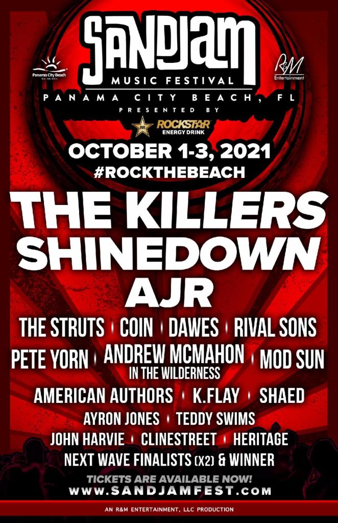 SandJam Music Festival Presented by Rockstar Energy Drink has become a must-see event in Panama City Beach, and organizers have announced the full lineup for the exciting weekend at Frank Brown Park, October 1-3, 2021. The Killers, Shinedown and AJR will headline, and over 20 of the top adult alternative rock acts are scheduled to perform over the festival’s three days.