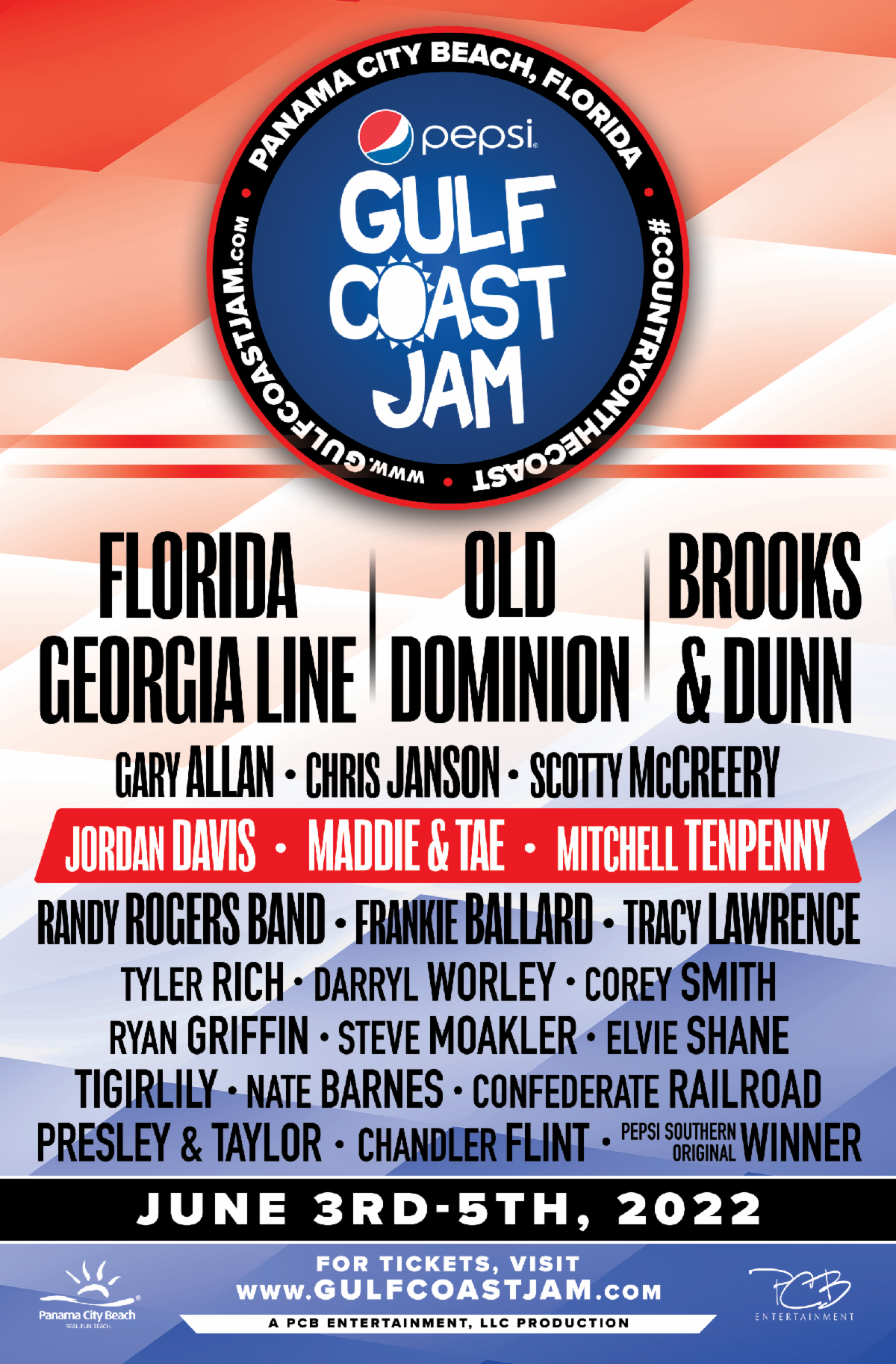 Jammers are encouraged to follow Pepsi Gulf Coast Jam at www.GulfCoastJam.com and on Facebook, Twitter and Instagram for additional announcements about the Pepsi Gulf Coast Jam.