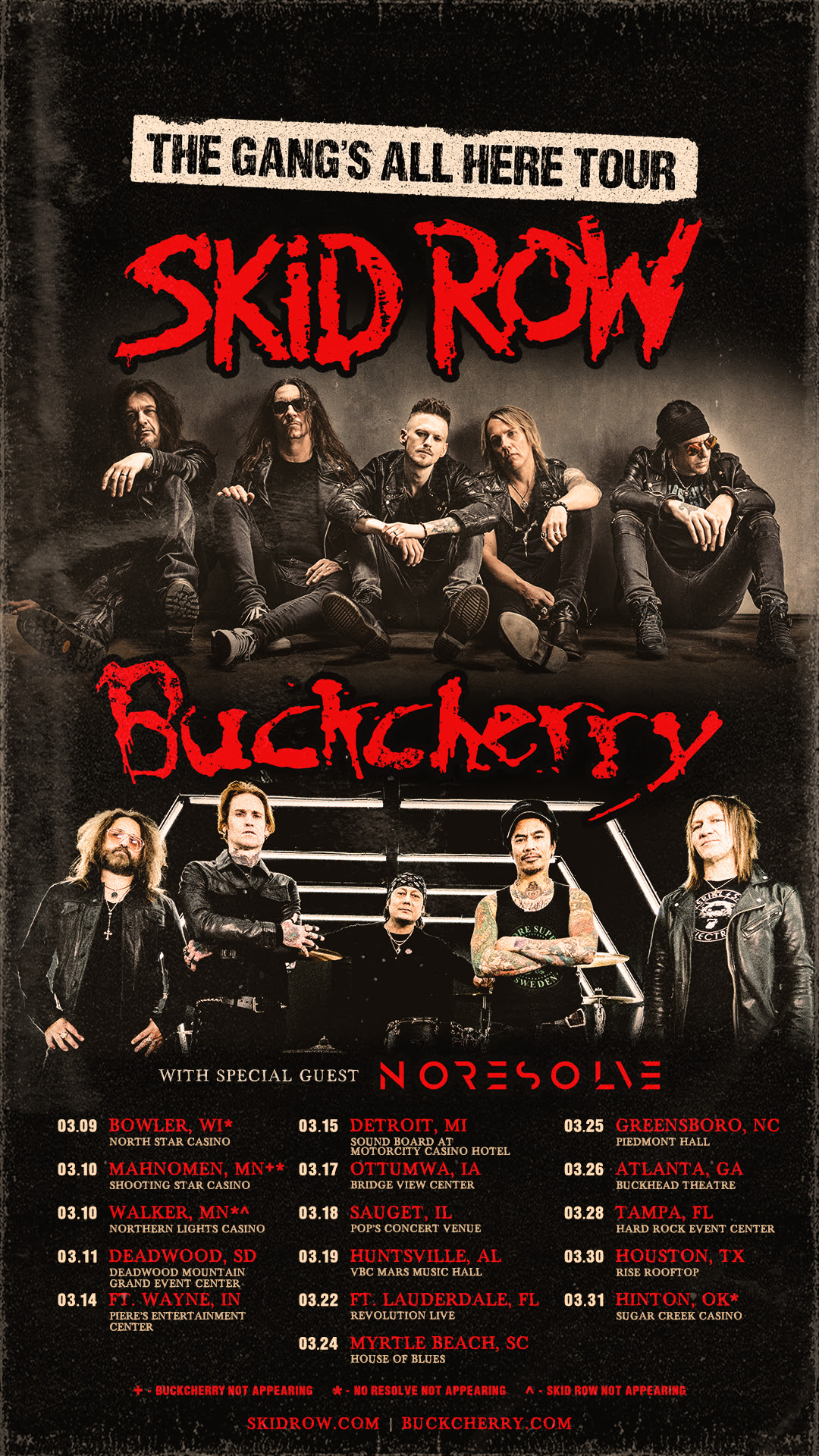 To welcome in 2023, Skid Row and Buckcherry announce today that they are teaming up for their co-headline “The Gang’s All Here” Tour this spring. Performances kick off on March 9 in Bowler, WI and continue throughout the month with special guests No Resolve providing support on select shows. All tour dates are listed below, with additional dates to be announced soon.