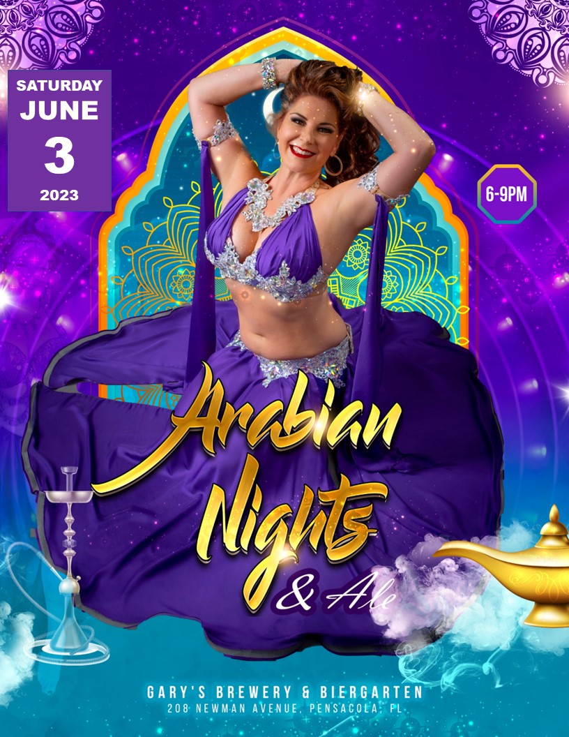 Arabian Nights & Ale takes place June 3, 2023, from 6 to 9pm at Gary’s Brewery & Biergarten located at 208 Newman Ave, 3403 Gulf Beach Hwy, Pensacola, FL 32507. Free admission for all guests.