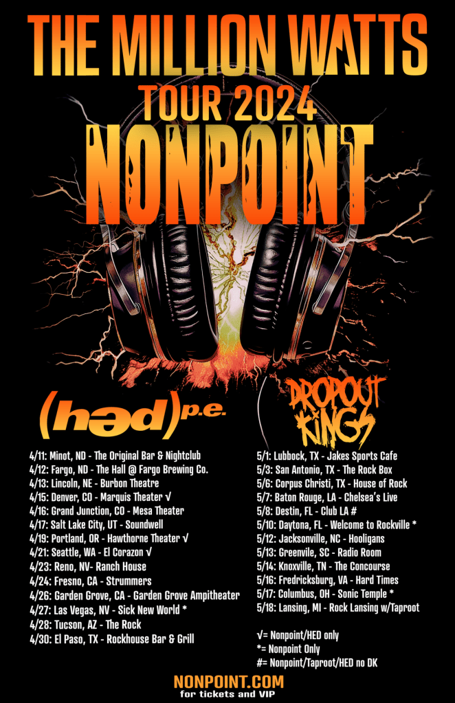 NONPOINT announced The Million Watts Tour 2024 with (Hed) P.E. and Dropout Kings this Spring! The tour will kick off on April 11th in Minot, ND at The Original Bar & Nightclub and concludes May 18th in Lansing, MI. In addition, Nonpoint has been added to the Louder Than Life festival in September.