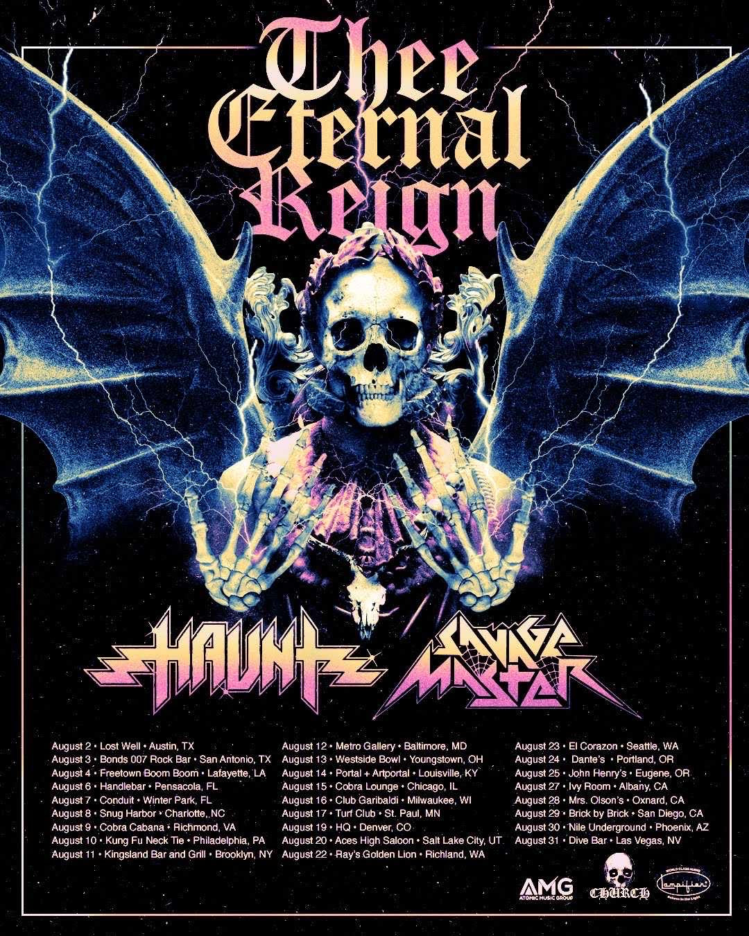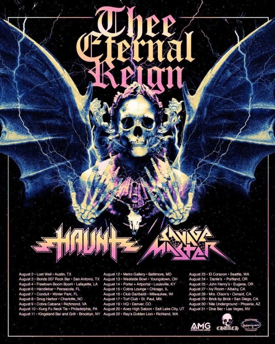 American heavy metal savants HAUNT and SAVAGE MASTER unite for heavy metal glory as they prepare to blaze across a 27-city US tour dubbed Thee Eternal Reign. Kicking off August 2 at The Lost Well in Austin, Texas, the bands will leave a path of steel shavings through nearly two dozen states, concluding August 31 at Dive Bar in Las Vegas, Nevada. See full dates listed as follows: